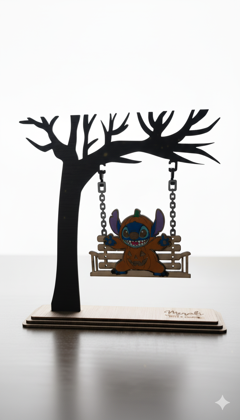 ¡Añade un toque mágico y juguetón de Halloween a tu hogar con este adorable adorno de Stitch Calabaza en su columpio!