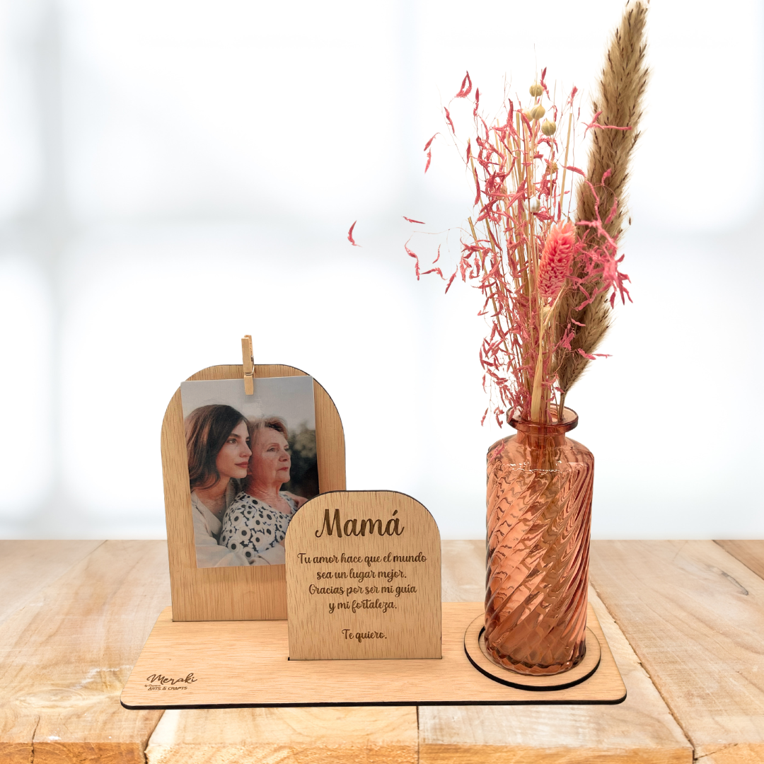 Descubre una pieza única de decoración que combina elegancia y sentimentalismo. Nuestro marco con pinza está diseñado para exhibir tus recuerdos más preciados de manera sofisticada. Este producto no es solo un marco, sino un hermoso conjunto que incluye una placa con una dedicatoria especial y un jarrón al lateral con flores secas cuidadosamente seleccionadas.