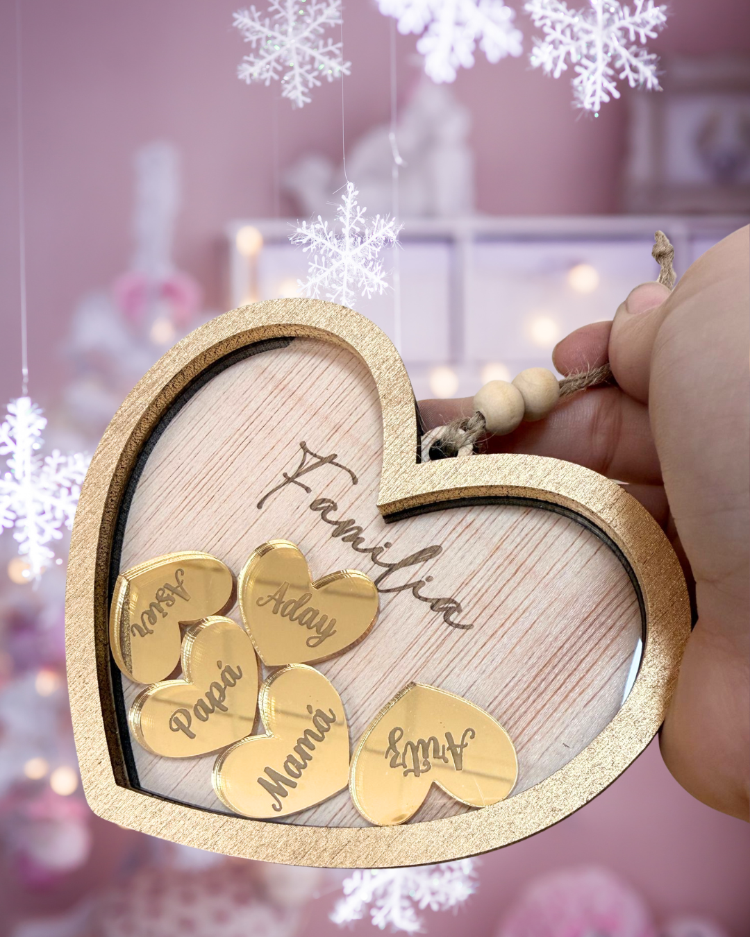 Celebra la magia de la Navidad con esta bola navideña en forma de corazón, un detalle único y personalizado perfecto para decorar el árbol o regalar a tus seres queridos. Fabricada en madera de alta calidad, incluye una ranura especial para introducir pequeños corazones de metacrilato personalizados con los nombres de cada miembro de la familia.